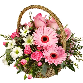 Trandafiri si gerbere in tonuri rozalii - un aranjament ce reuseste sa stranga primele raze ale soarelui de vara si prospetimea picaturilor de roua. Toate acestea punctate de crizanteme delicate, albe, asternute pe un pat verde, intr-un contrast placut cu nuantele pastelate ale florilor. Acest cos este ideal pentru a spune "buna dimineata" unei persoane dragi, in cel mai original mod posibil!